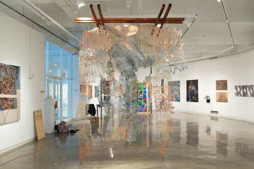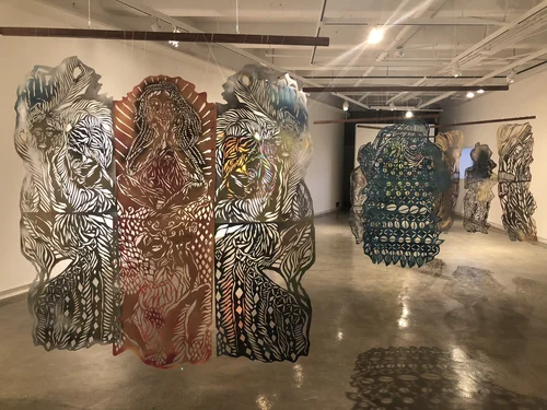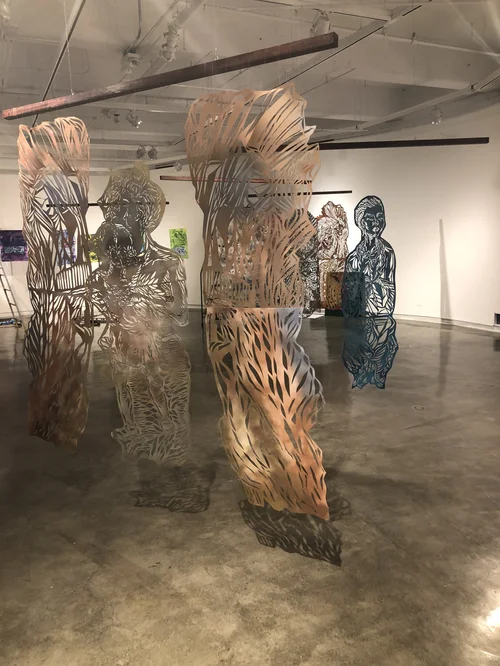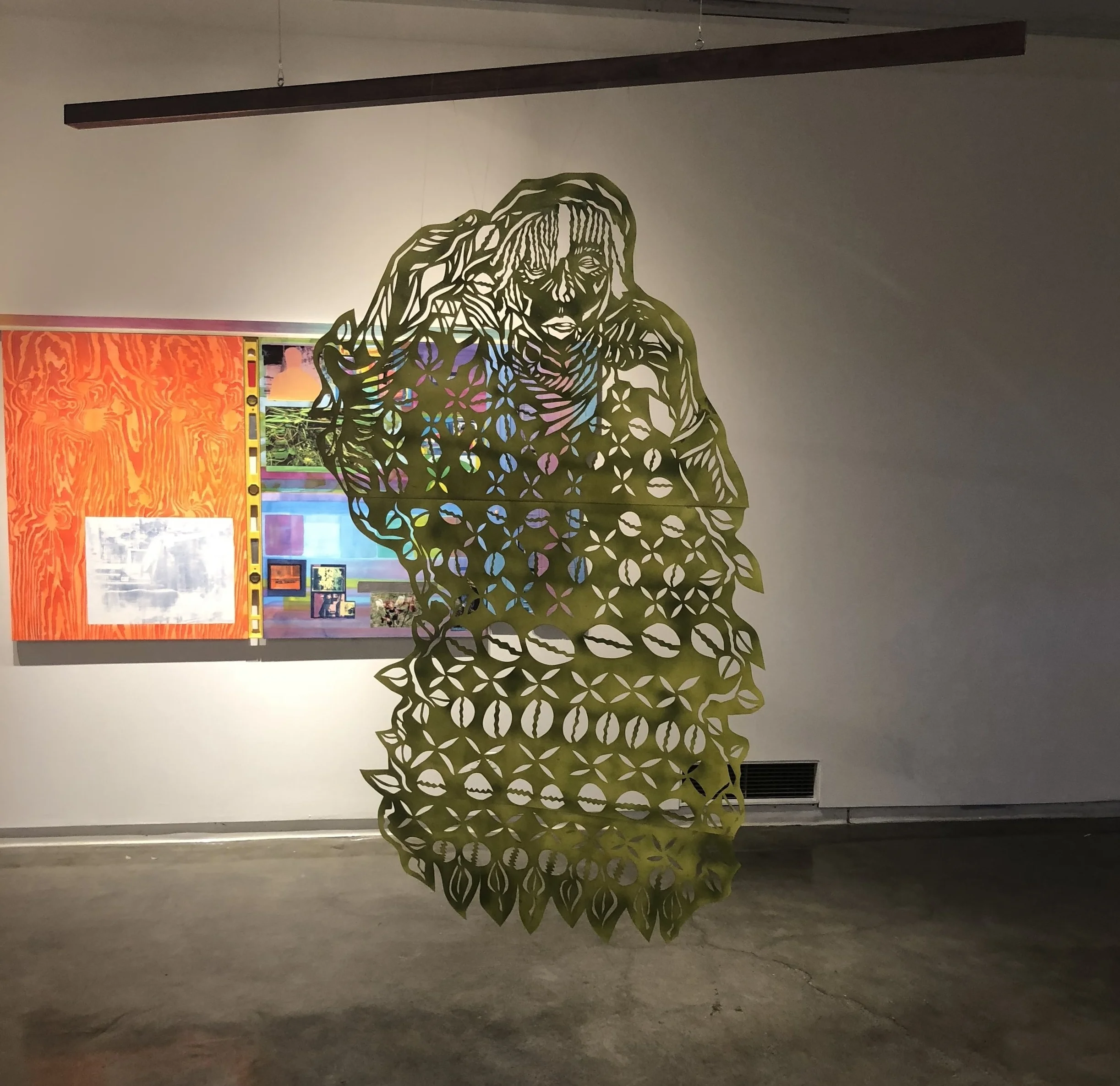 A figurative installation of a lively, patterned, and tribal paper doll. 2018.